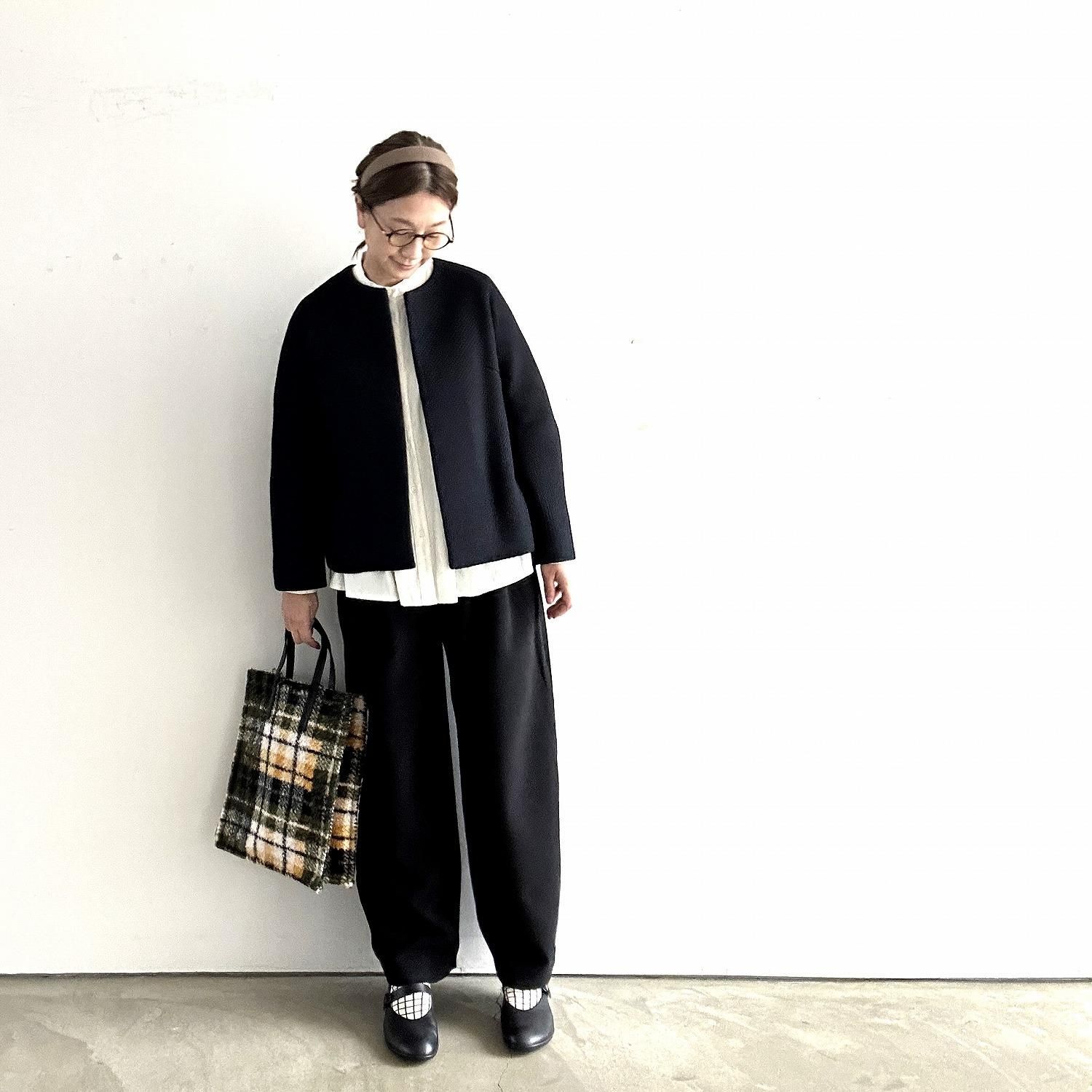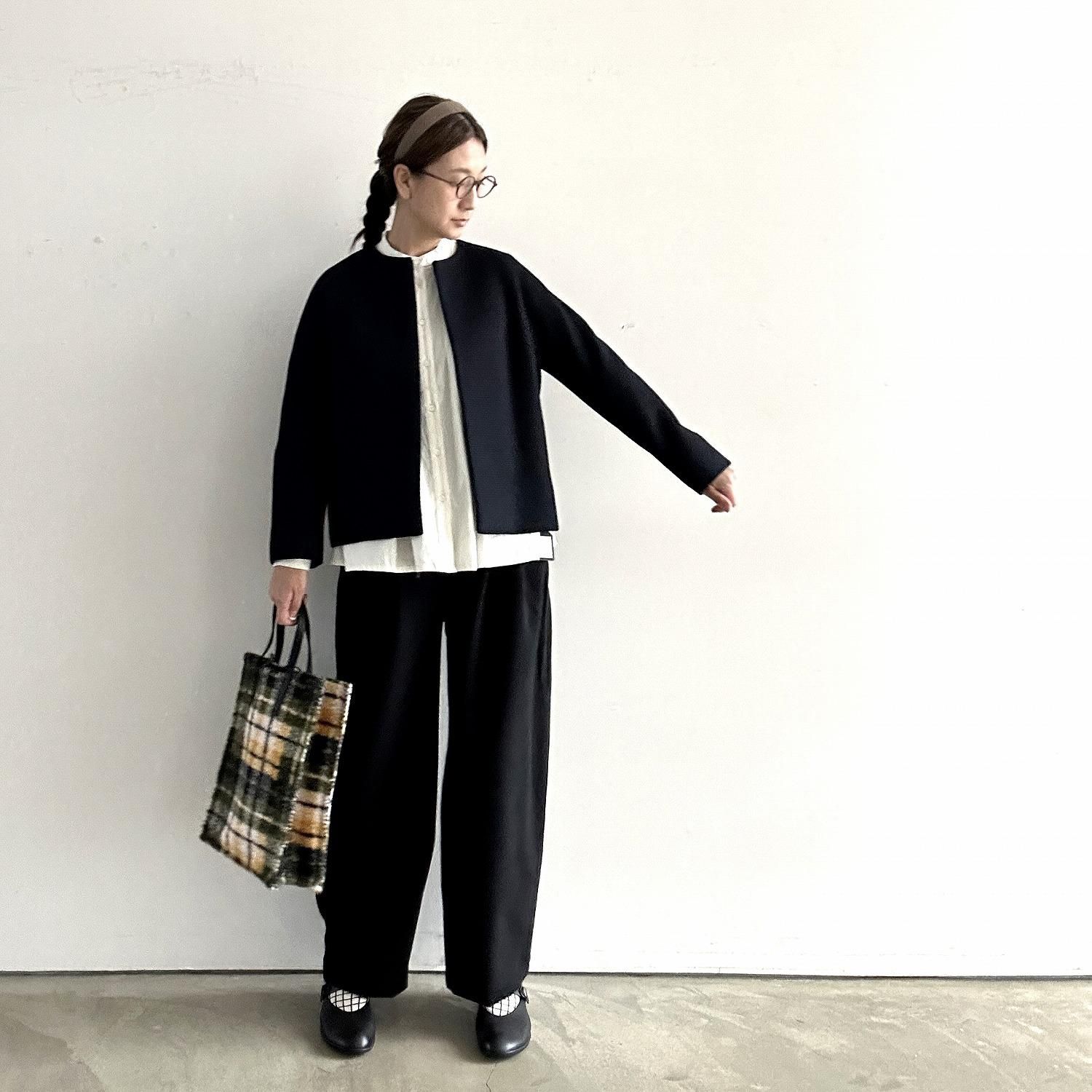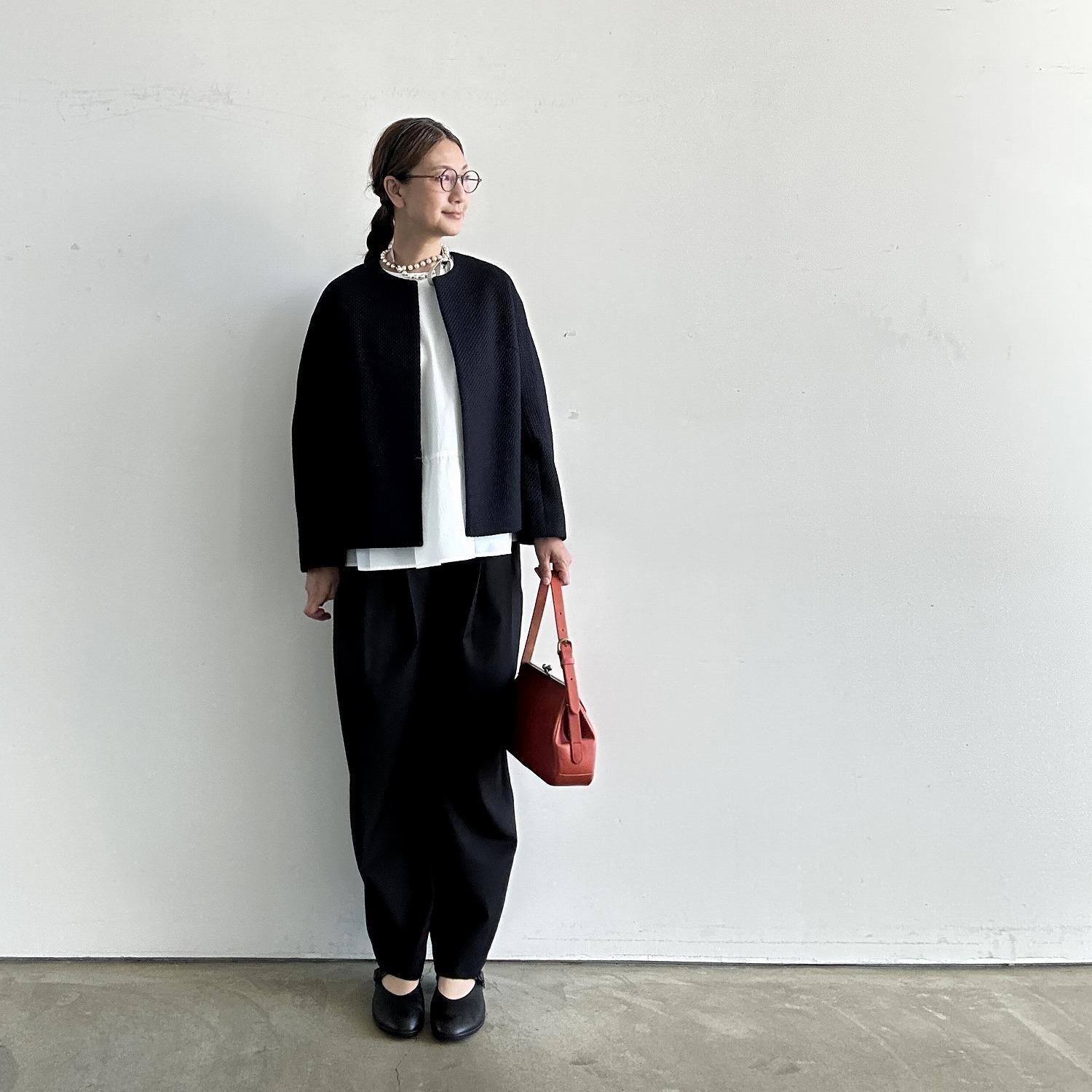 首元がすっきりとしたノーカラージャケットなので下に合わせるトップスで印象を変えることができます。ボタンがないのでバサッと羽織って完成。なのにきちんと感がだしてくれます。