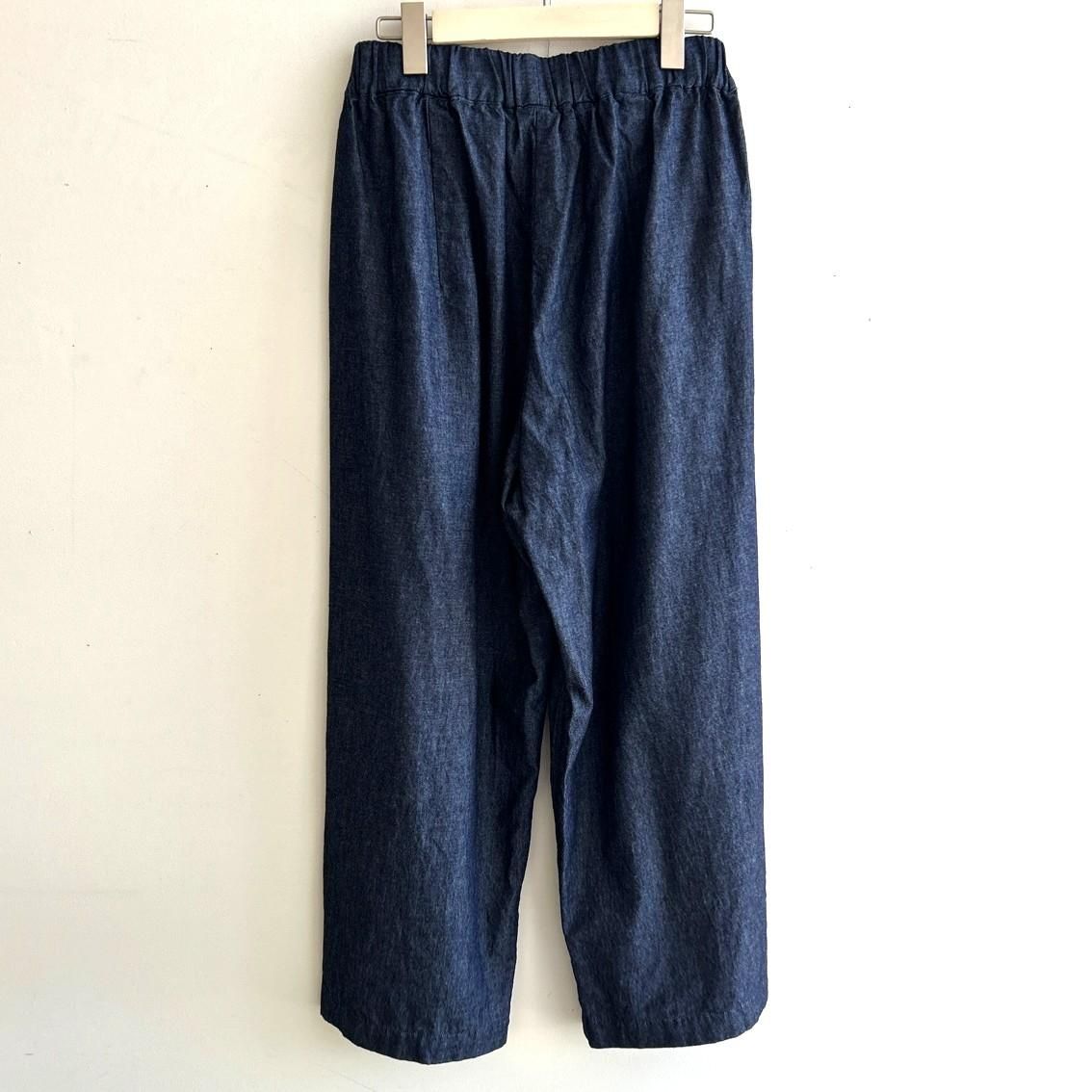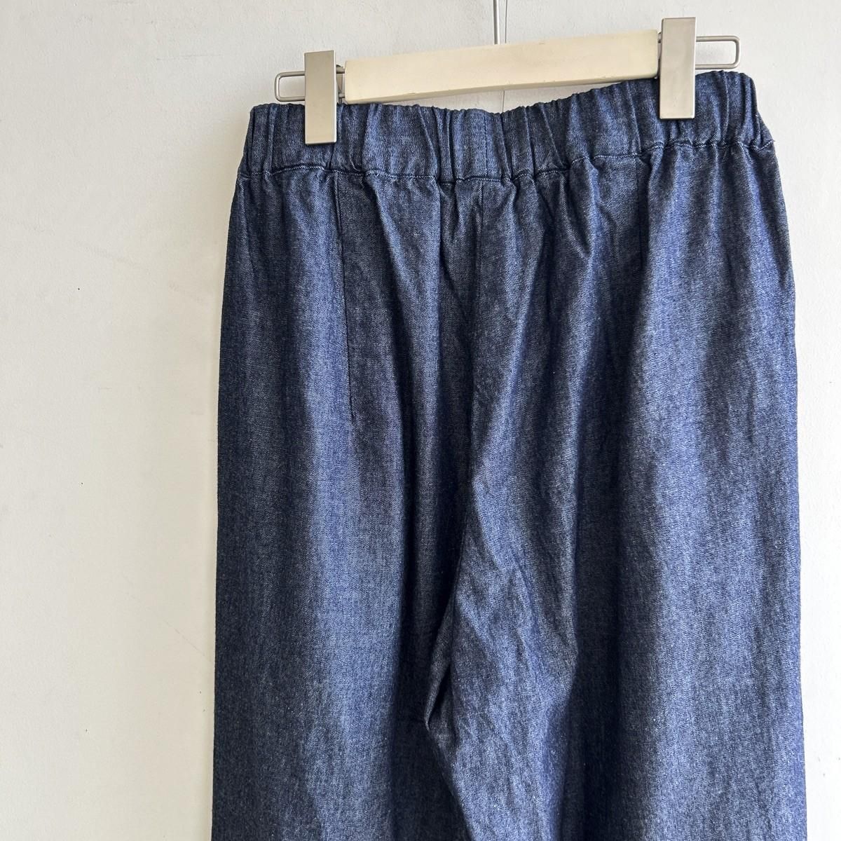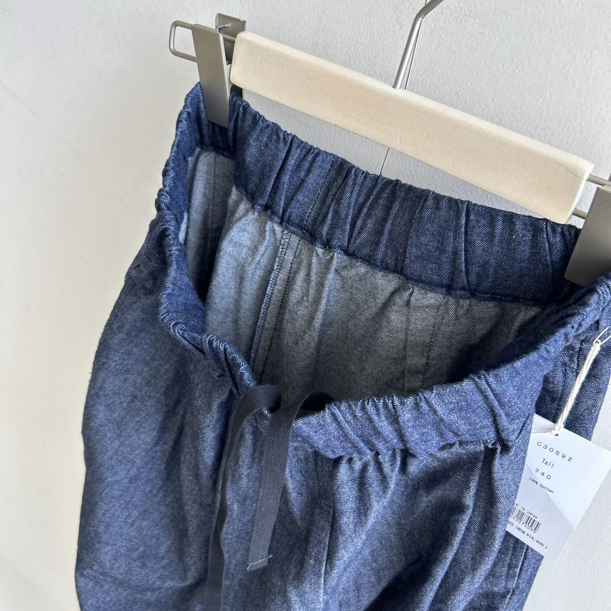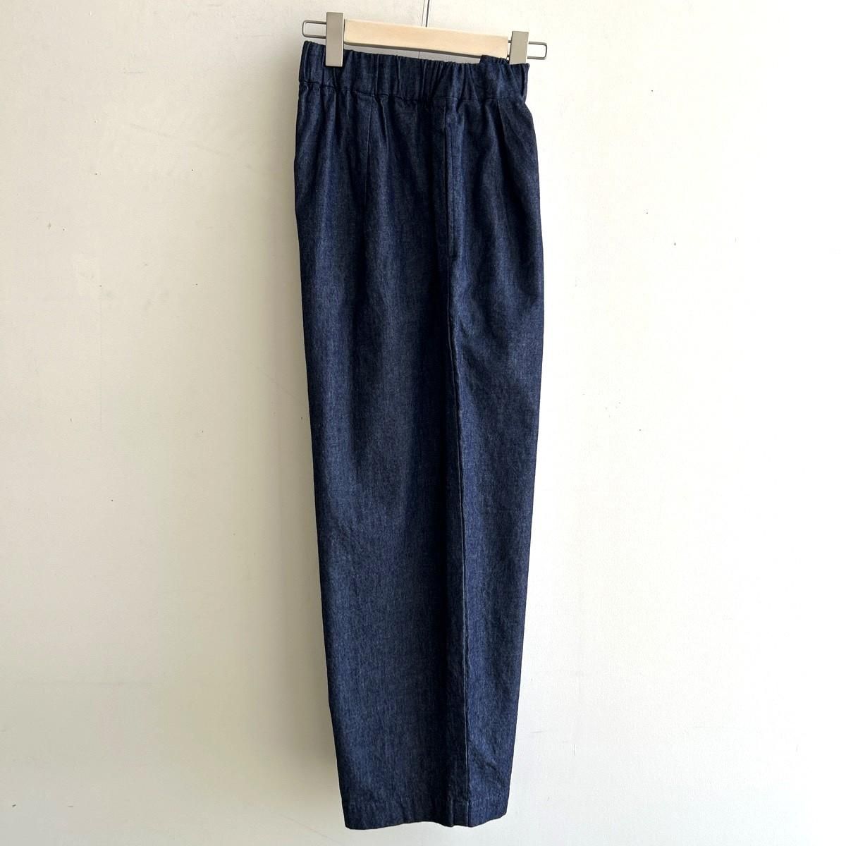 フロントのタックと総ゴムのウエスト、内側の紐で調整可能。柔らかなデニム生地、日常使いでもストレスになりません。ウエストゴムで楽なのにすっきり見え、ストレートながら裾に向かってほのかに細まるラインが、バランスのいい着こなしを叶えます。毎日にちょうどいい、気負わない大人のワークスタイル。