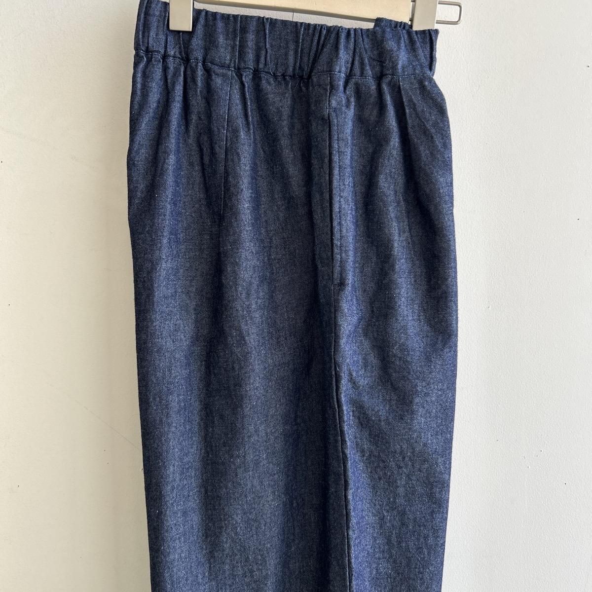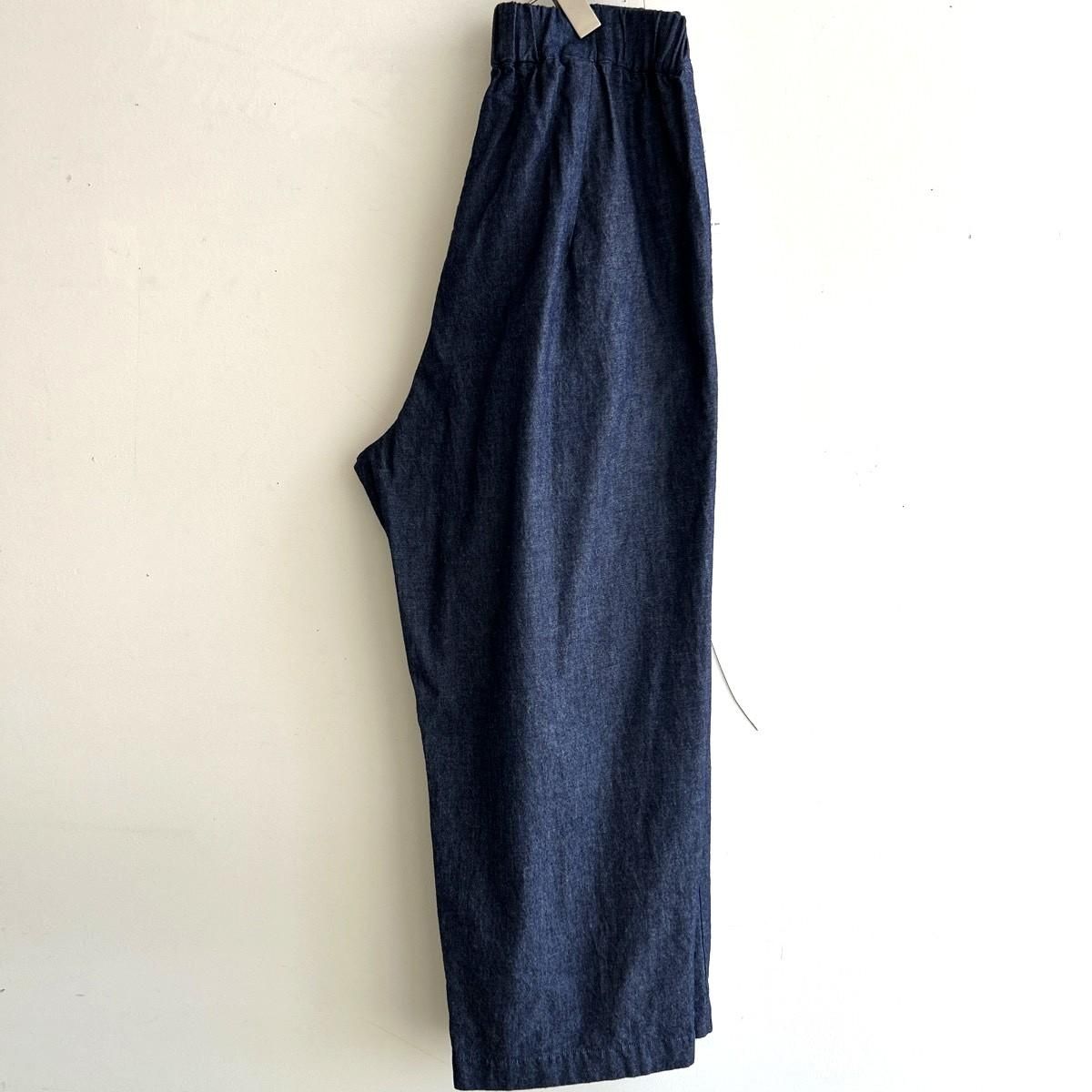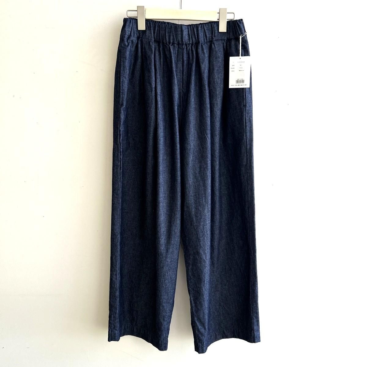 フロントのタックと総ゴムのウエスト、内側の紐で調整可能。柔らかなデニム生地、日常使いでもストレスになりません。ウエストゴムで楽なのにすっきり見え、ストレートながら裾に向かってほのかに細まるラインが、バランスのいい着こなしを叶えます。毎日にちょうどいい、気負わない大人のワークスタイル。