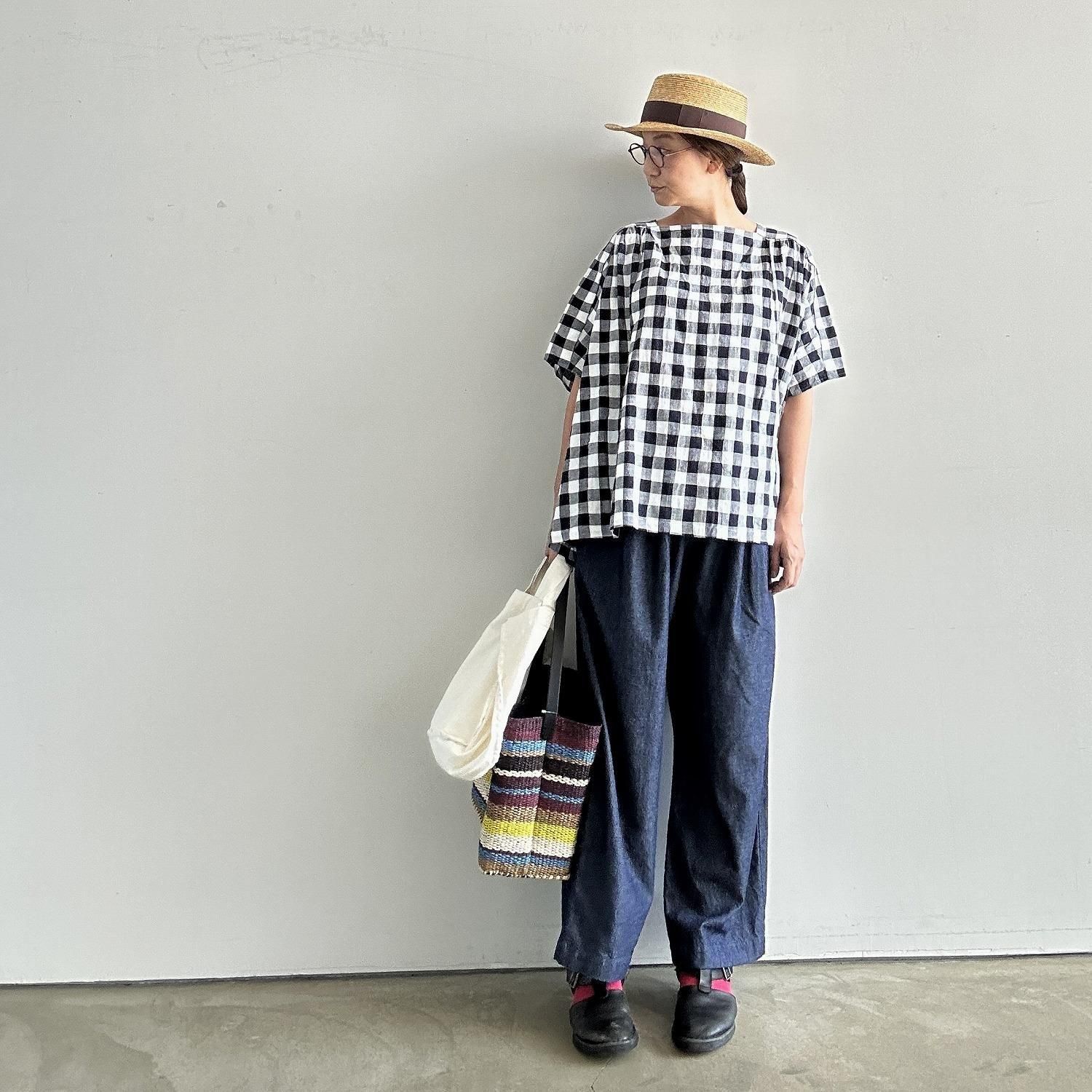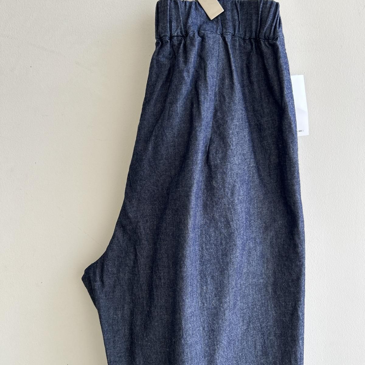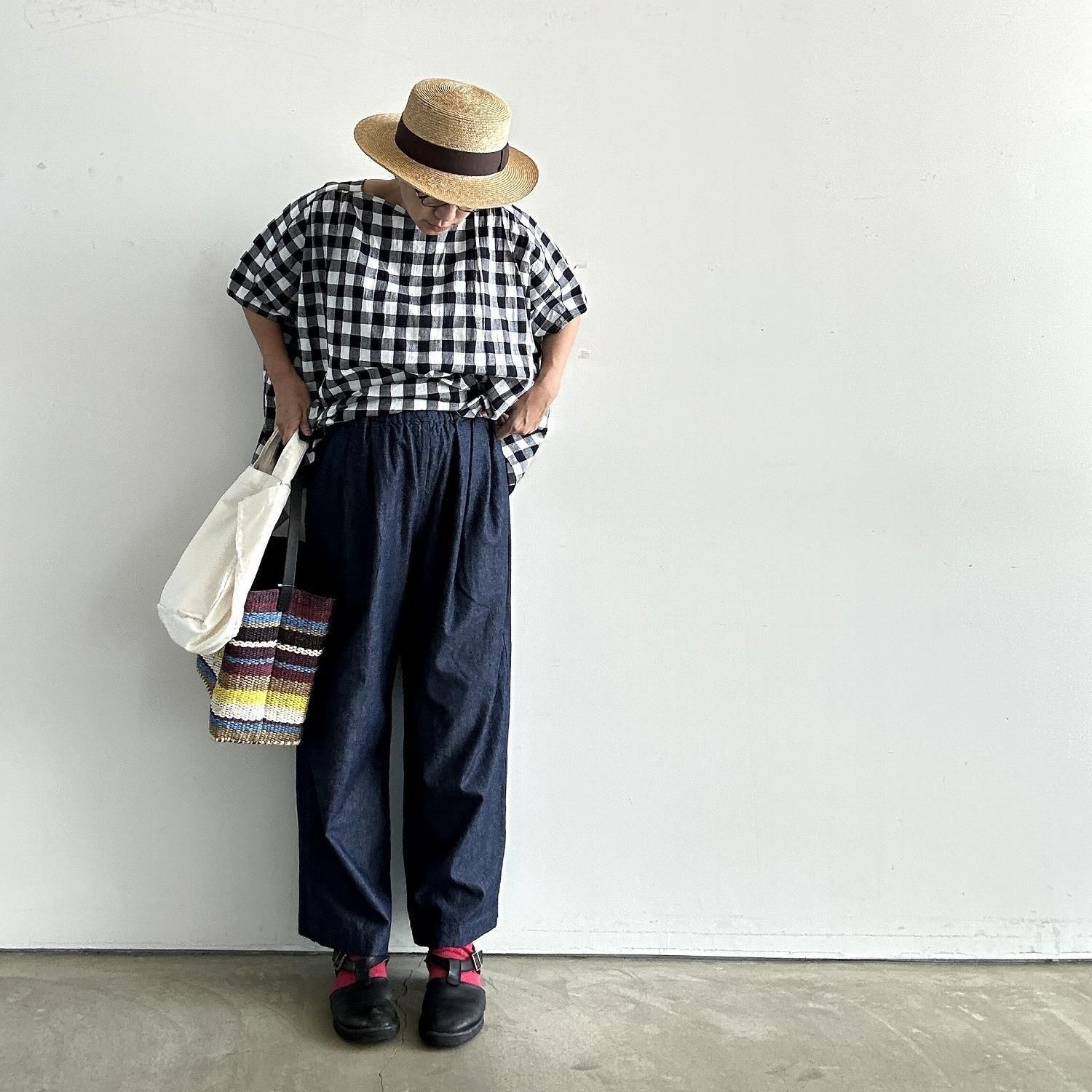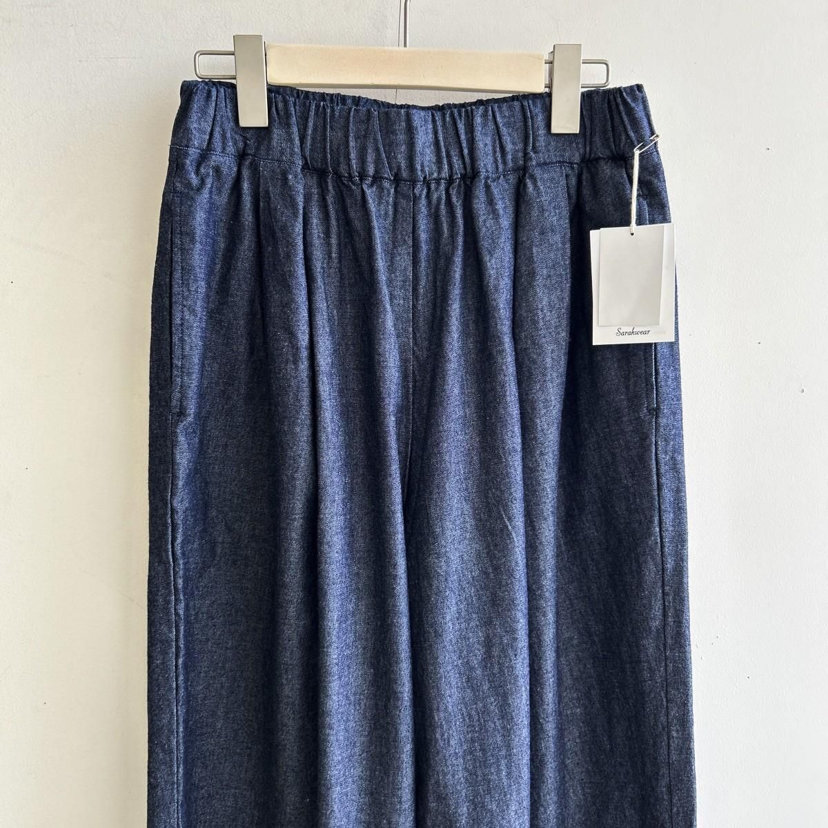 フロントのタックと総ゴムのウエスト、内側の紐で調整可能。柔らかなデニム生地、日常使いでもストレスになりません。ウエストゴムで楽なのにすっきり見え、ストレートながら裾に向かってほのかに細まるラインが、バランスのいい着こなしを叶えます。毎日にちょうどいい、気負わない大人のワークスタイル。