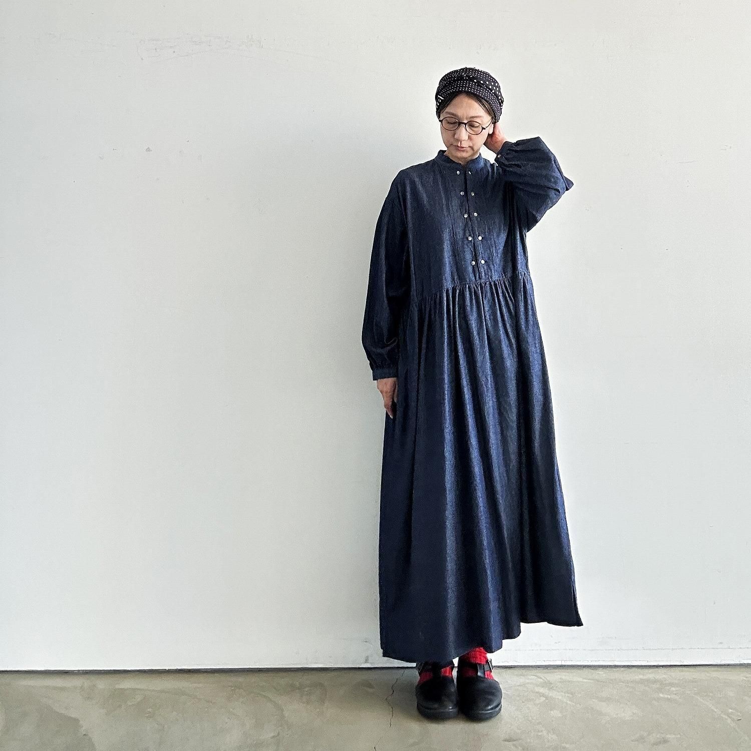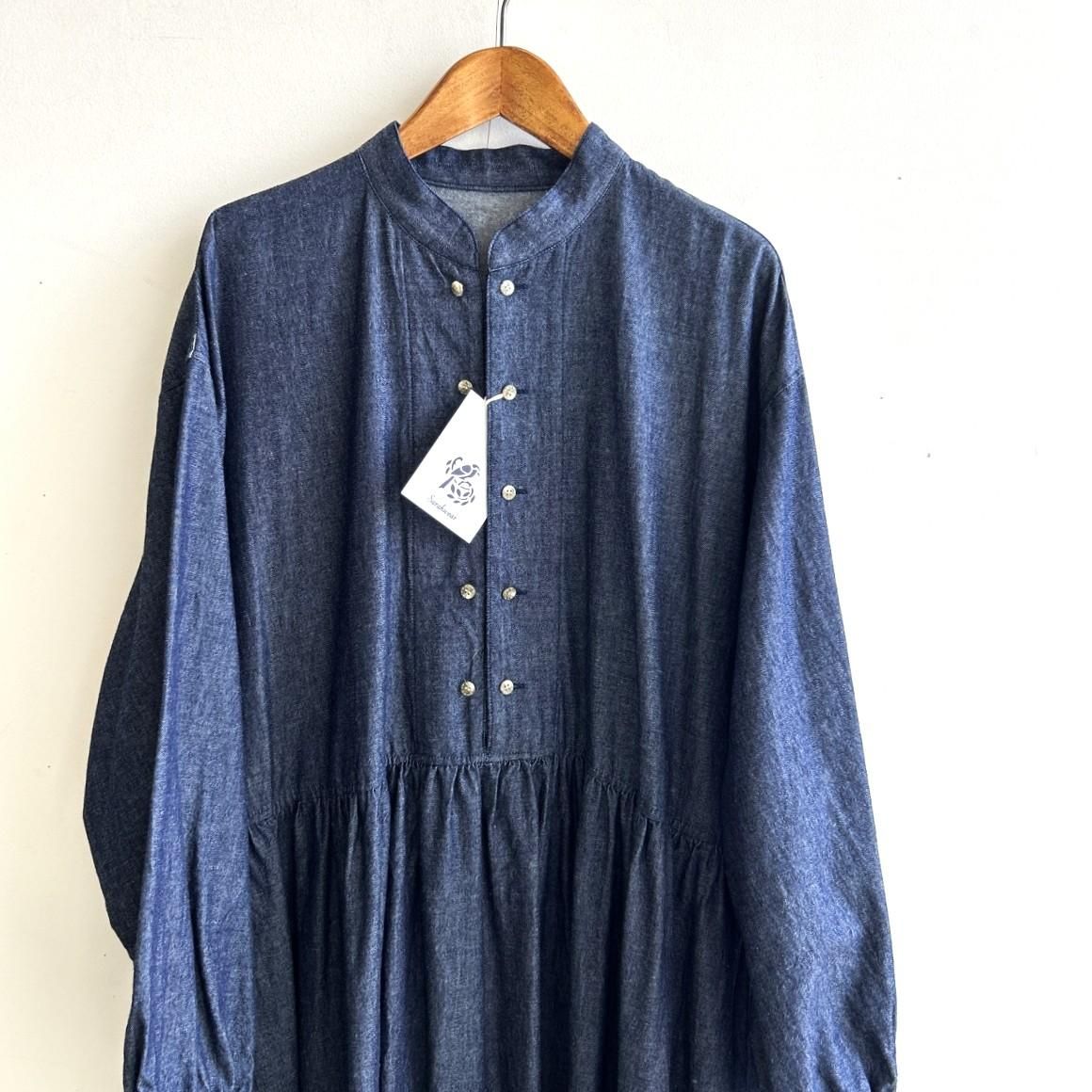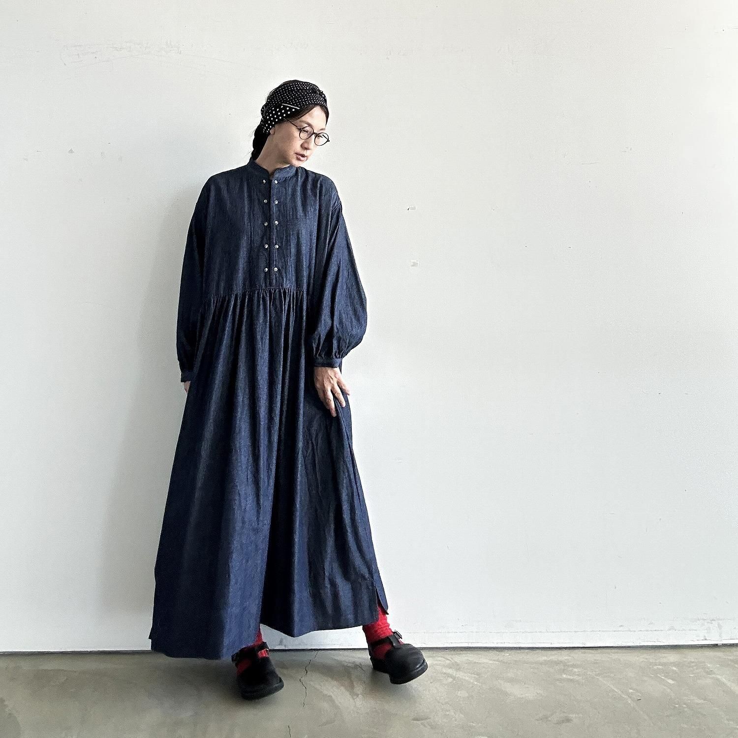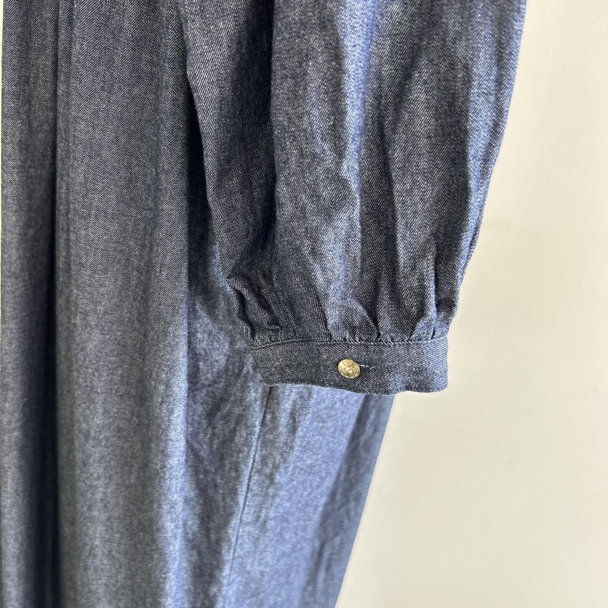 使用したのは、軽量でソフトな風合いのデニム生地。ワークテイストの中に可愛らしさのあるファーマーズドレス。柔らかな肌触りが心地よく、たっぷりの分量ながら広がりすぎず、すっきりと収まる絶妙なバランス。