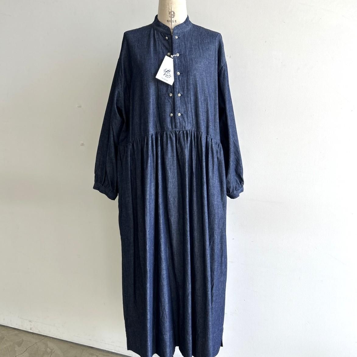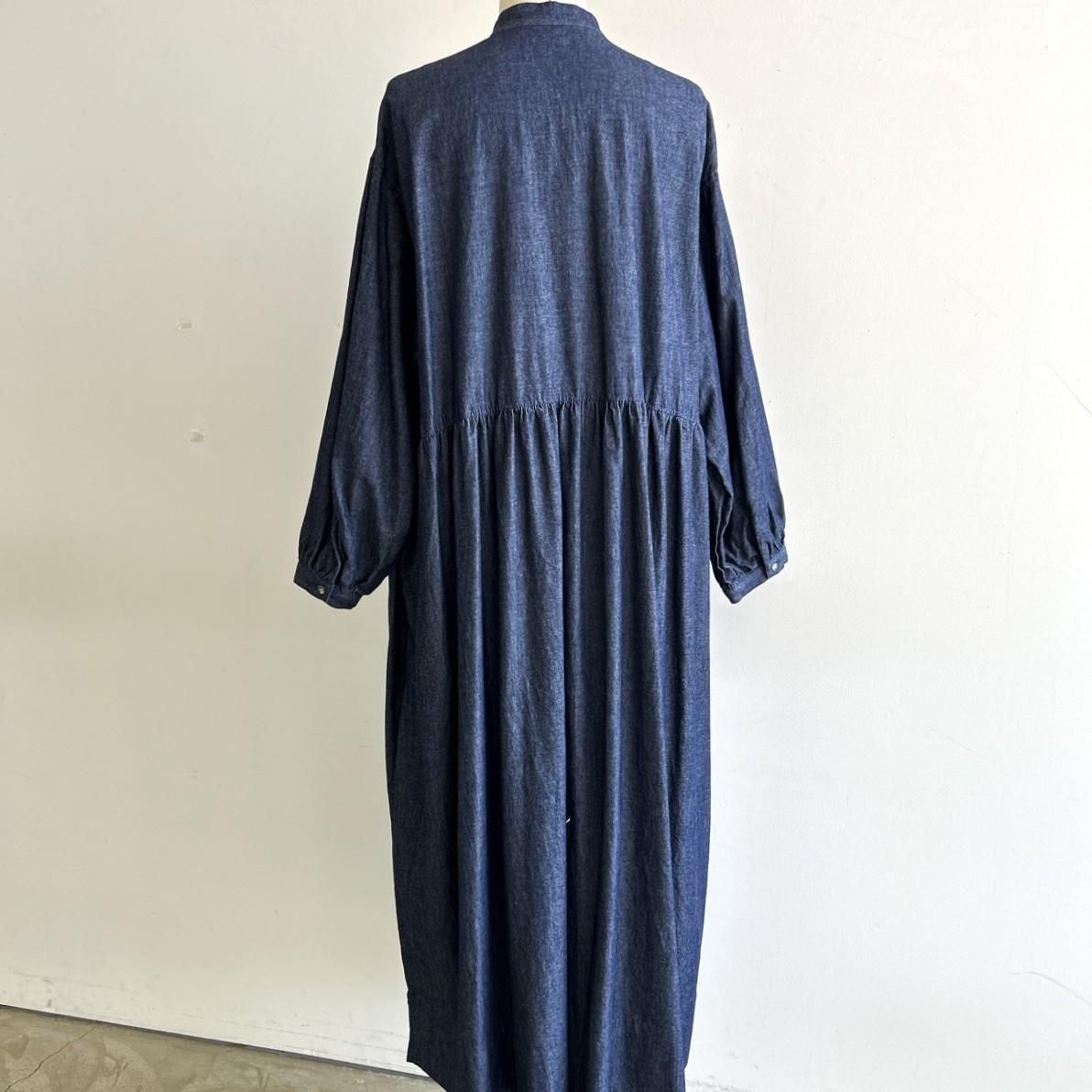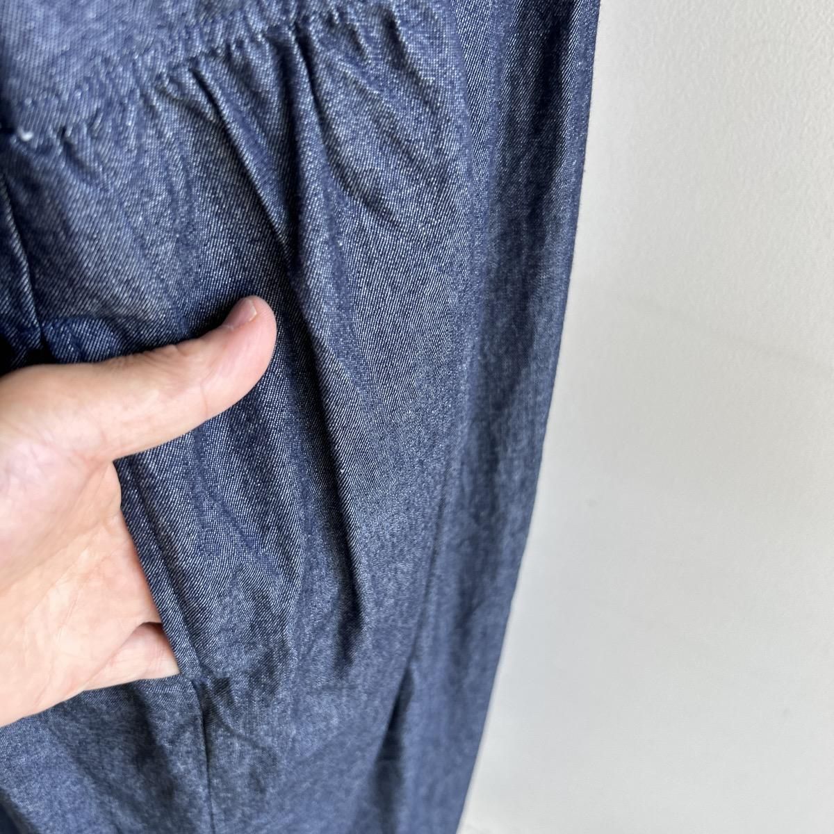 使用したのは、軽量でソフトな風合いのデニム生地。ワークテイストの中に可愛らしさのあるファーマーズドレス。柔らかな肌触りが心地よく、たっぷりの分量ながら広がりすぎず、すっきりと収まる絶妙なバランス。