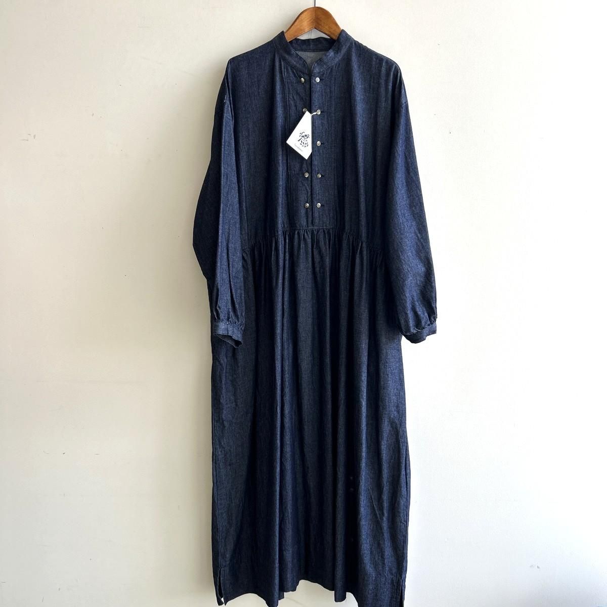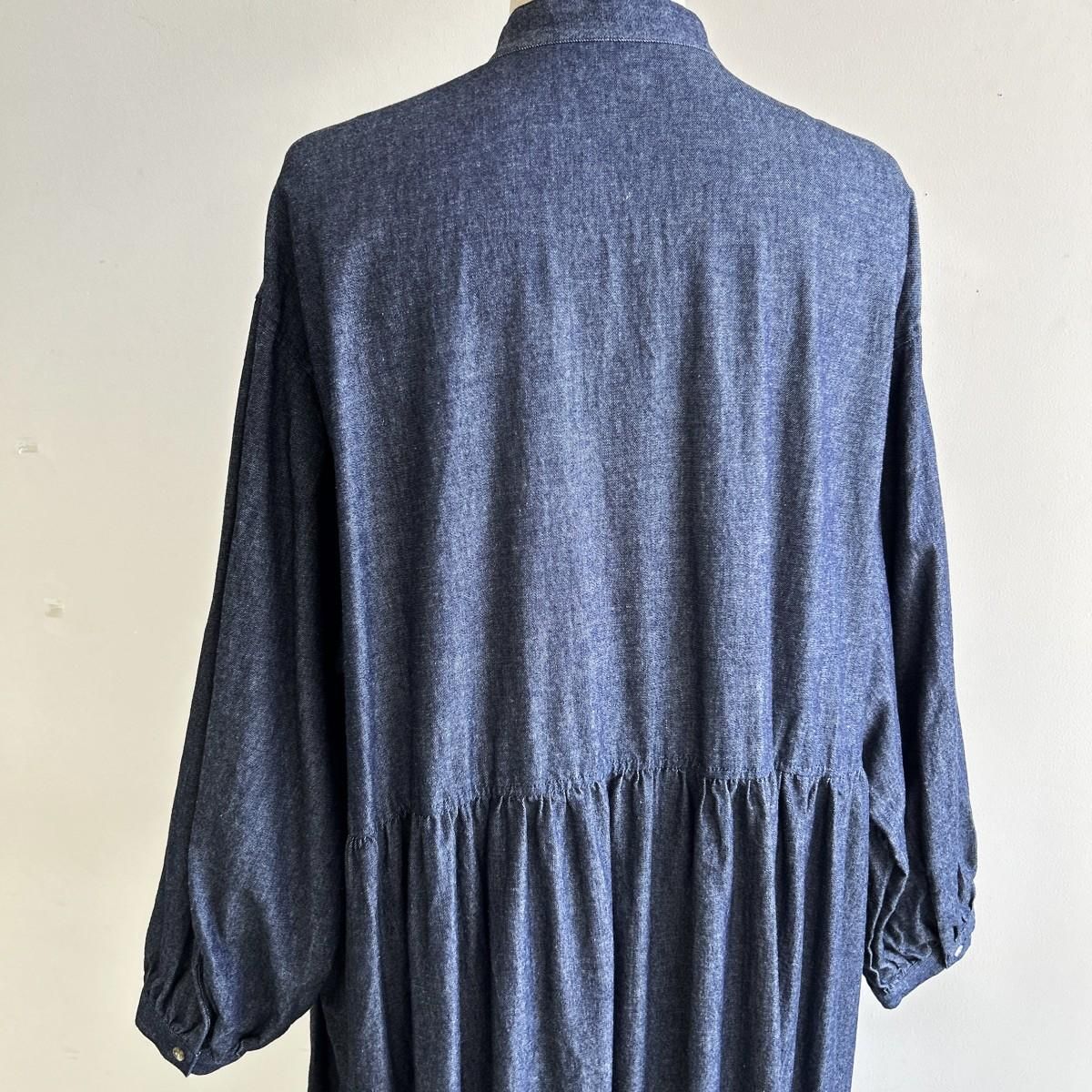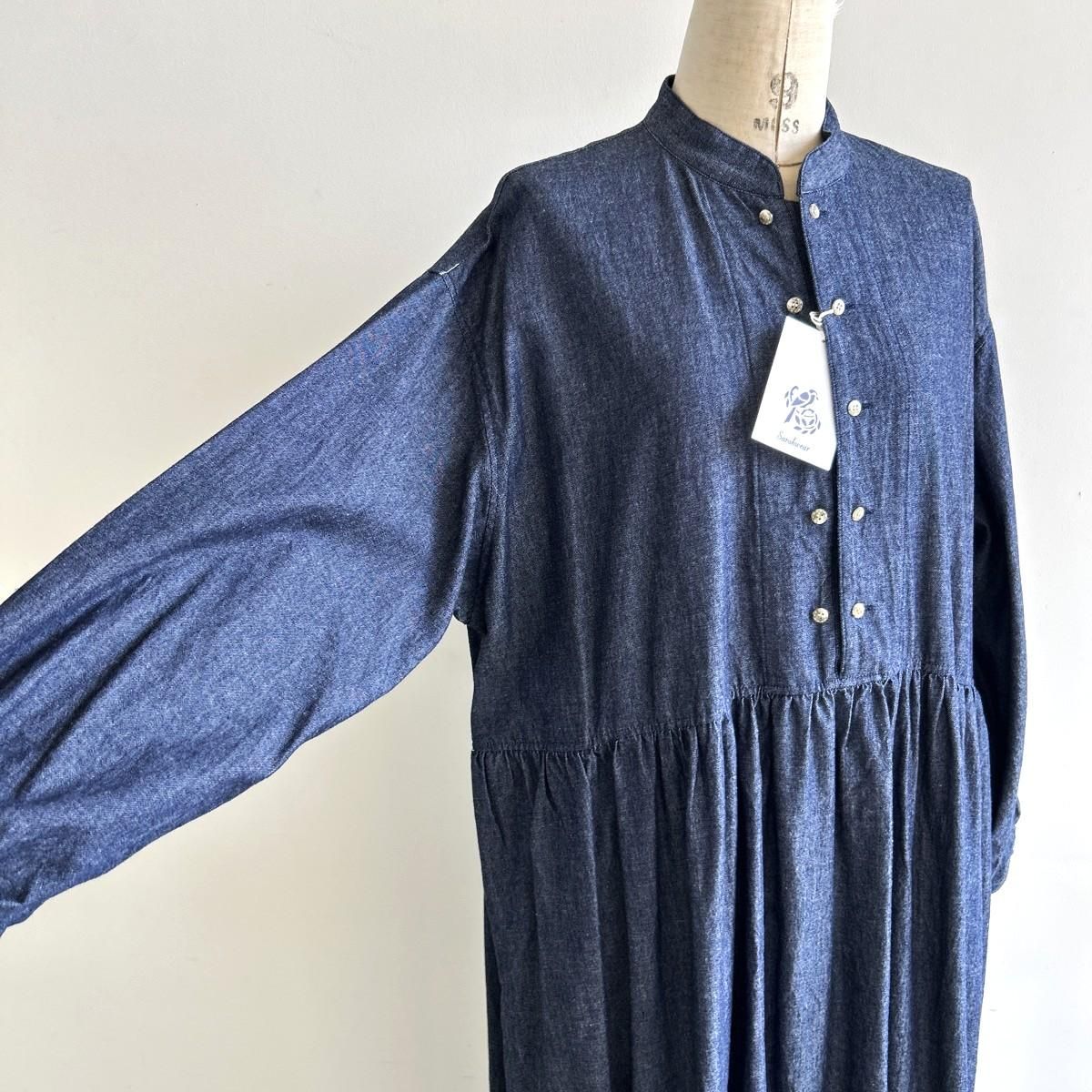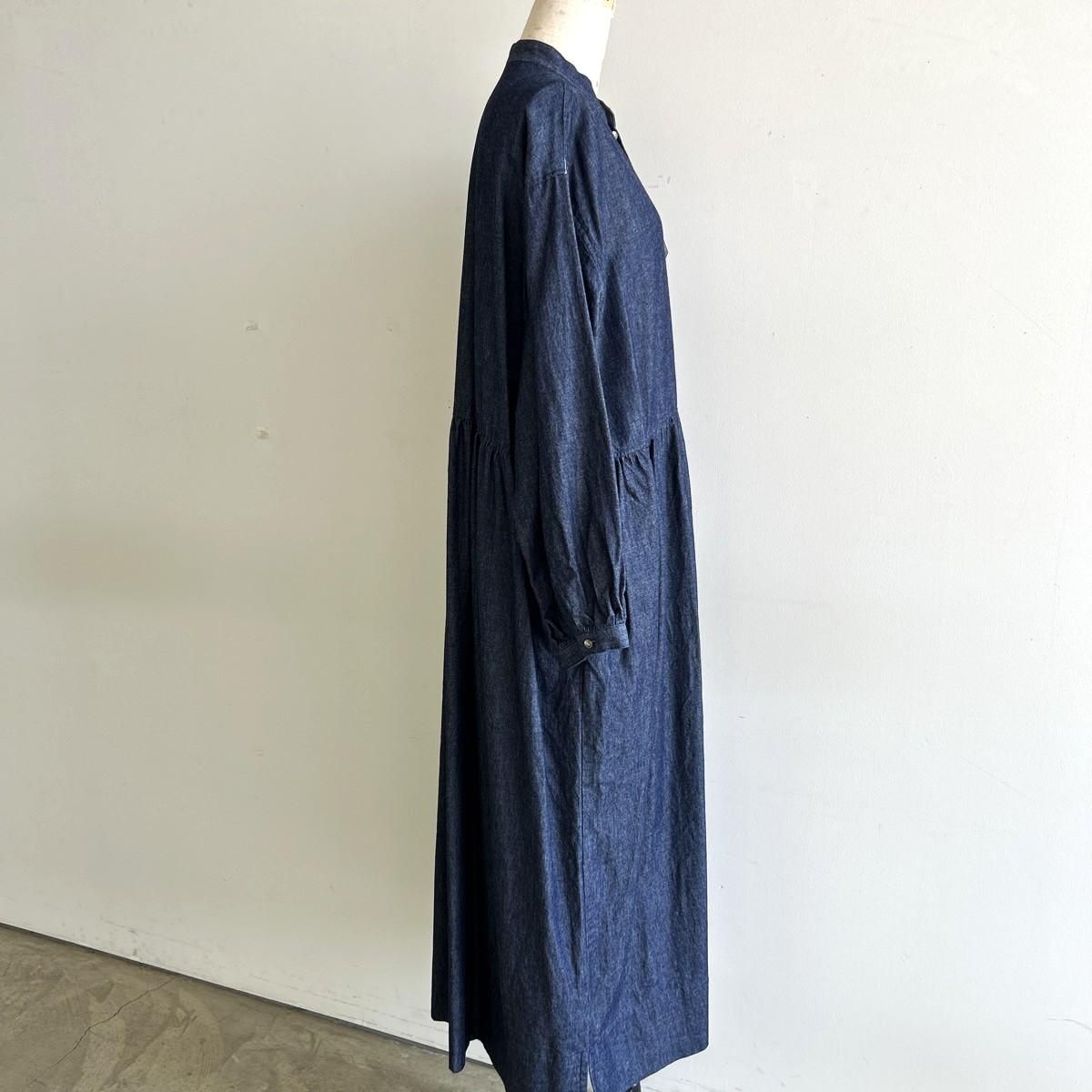 使用したのは、軽量でソフトな風合いのデニム生地。ワークテイストの中に可愛らしさのあるファーマーズドレス。柔らかな肌触りが心地よく、たっぷりの分量ながら広がりすぎず、すっきりと収まる絶妙なバランス。