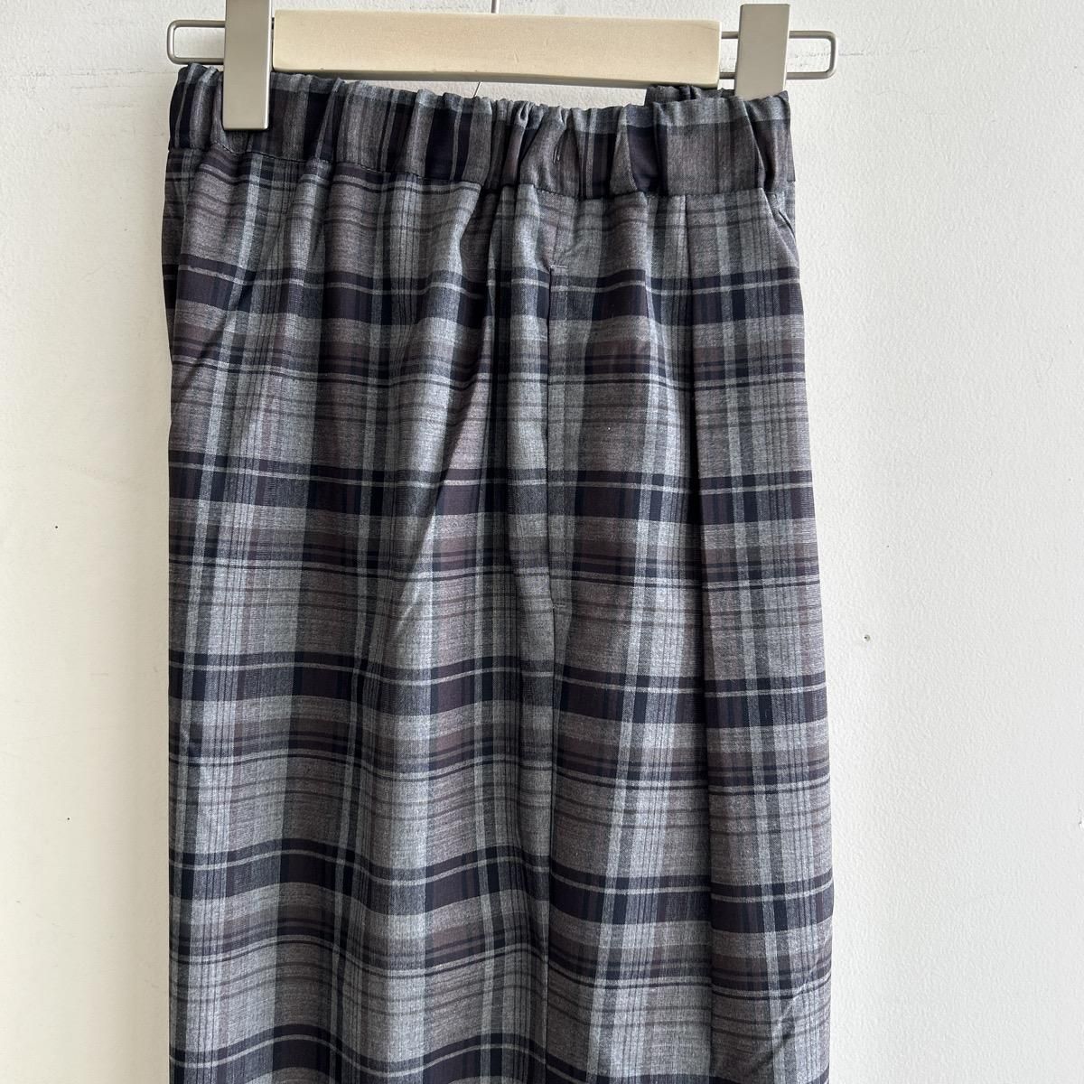 ポリエステル、ウール、レーヨンをブレンドした生地は、軽やかでドライな質感が特徴。ハリとしなやかさのバランスがちょうど良い。シワになりにくく、美しいシルエットをキープします。控えめな光沢感のチェック柄が、大人っぽくシックな雰囲気を演出。落ち着いたトーンで、どんなトップスとも合わせやすい一着です。
